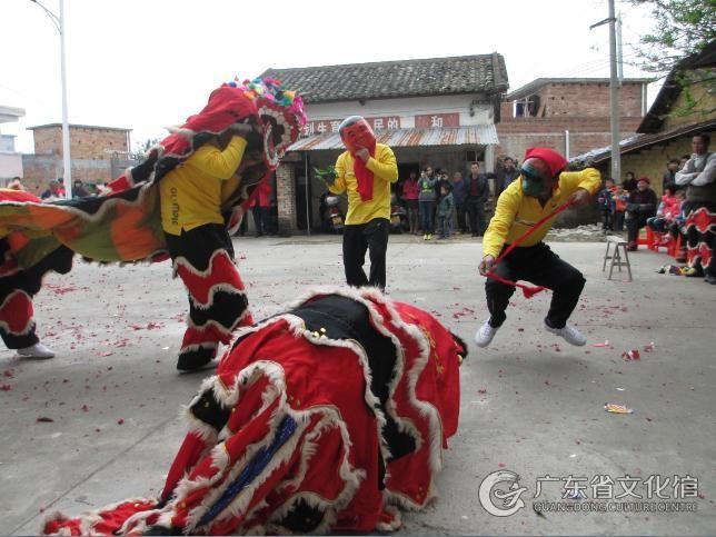 猫头狮又叫客家狮、獬、豸,是从化特有的狮舞品种,流传至今已有300多年历史,是与珠三角一带盛行的本地狮并存的传统舞蹈。猫头狮最早记载见于清宣统元年《从化县志》“岁时民俗”:“立春前一日,有司迎土牛于东郊,里市饰百戏及狮象。”在从化鳌头镇新围村、城郊街北星村及江埔街凤一村等客家村,每当有神庙滩头祭祀、宗族礼仪、拜春节年贺寿时,人们必会敲锣打鼓吹唢呐,架起猫头狮、戴上面具,闪展腾挪地舞狮以驱邪镇妖,盼如意吉祥。