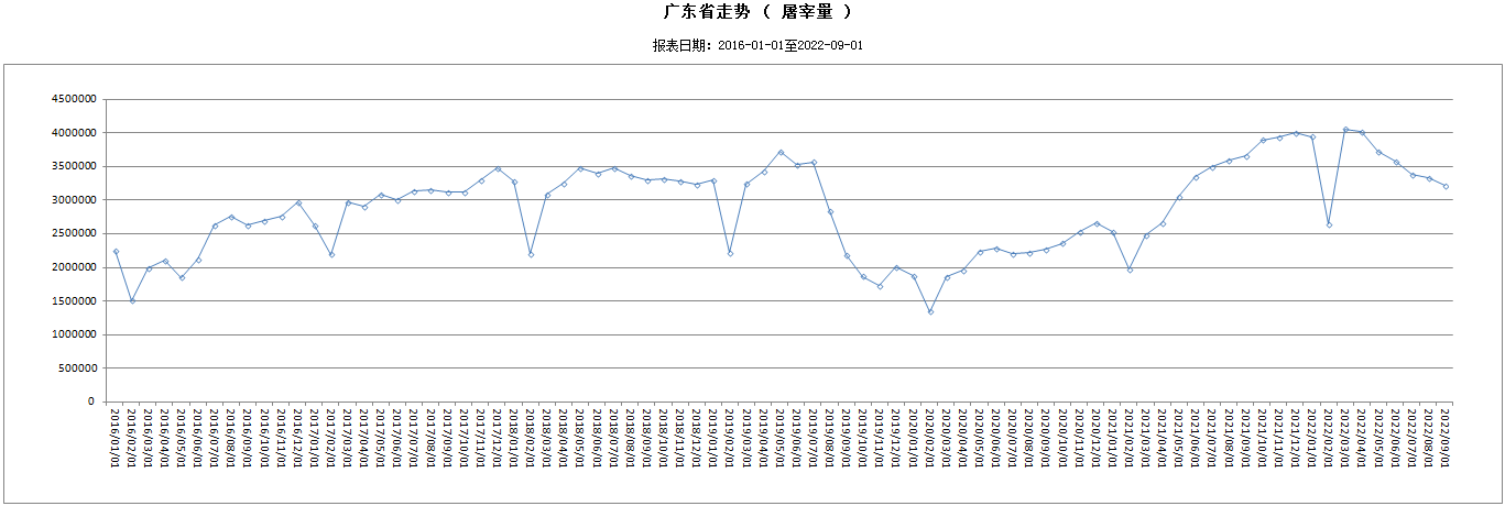 据对全省319家生猪定点屠宰企业跟踪监测,9月份共屠宰生猪3226459头,比8月份下降3.03%。