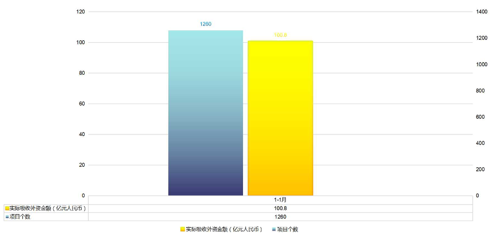 2021年1月,全省吸收实际外资100.8亿元,同比增长2.0%;新设外商直接投资项目1260个,同比下降11.9%。