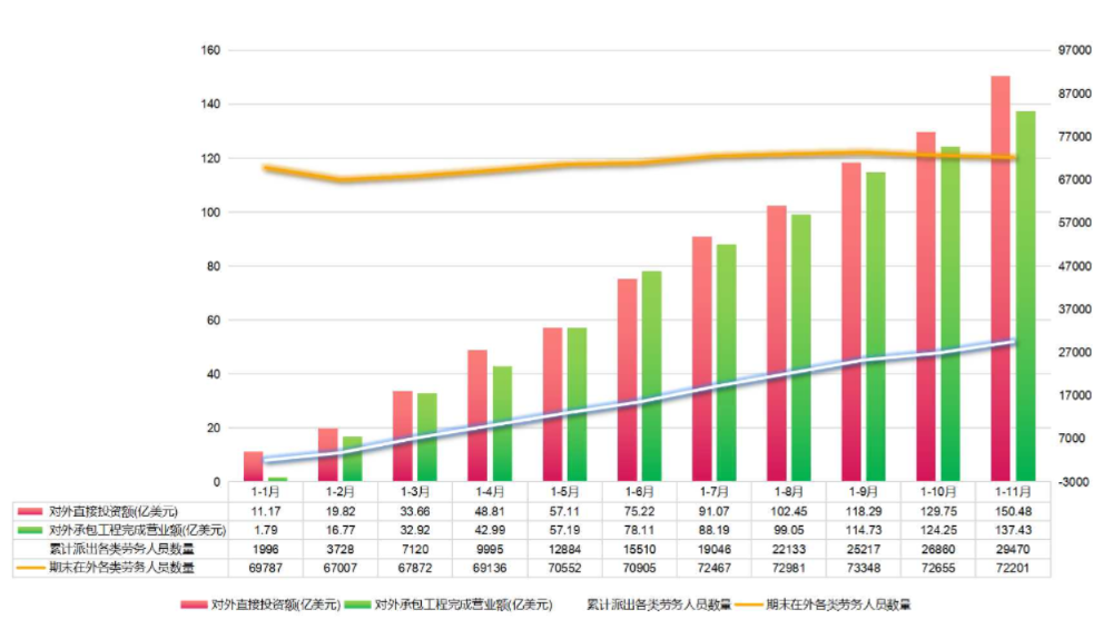 2021年1-11月,我省对外非金融类直接投资额150.48亿美元,同比增长4.37%。对外承包工程完成营业额137.43亿美元,劳务项下和工程项下累计派出各类劳务人员29470人,期末在外各类劳务人员72201人。