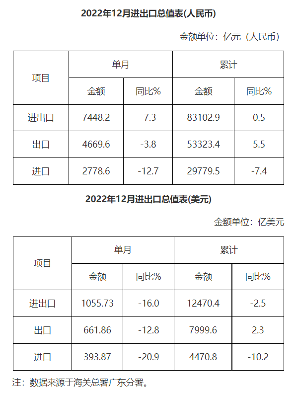 广东省外贸进出口总值表(2022年12月)