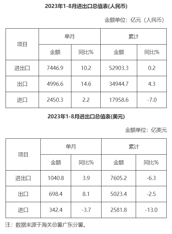 广东省外贸进出口总值表(2023年1-8月)