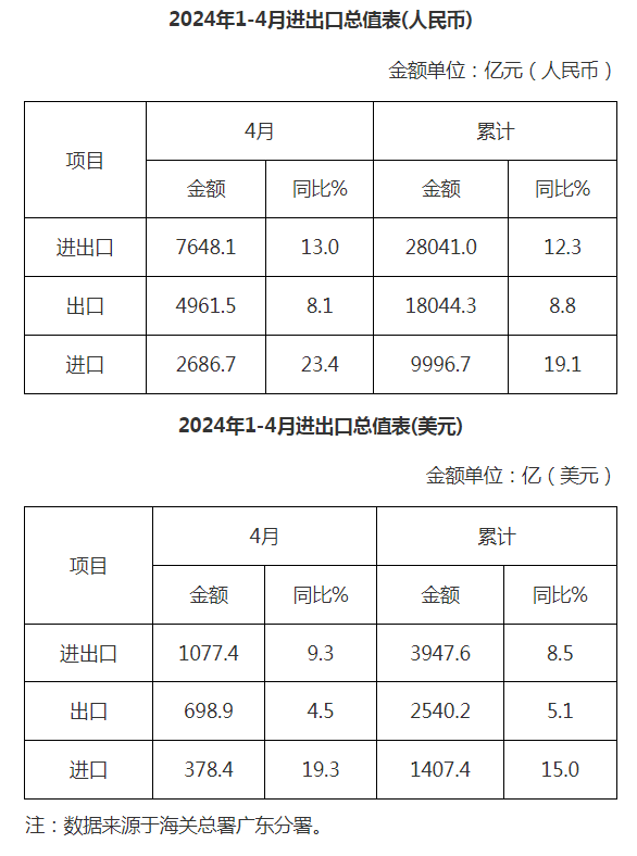 广东省外贸进出口总值表(2024年1-4月)
