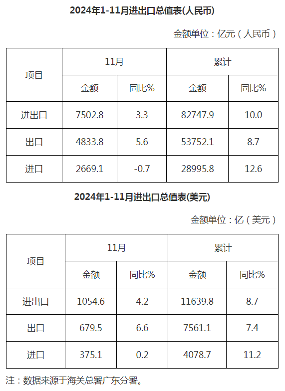 广东省外贸进出口总值表(2024年1-11月)