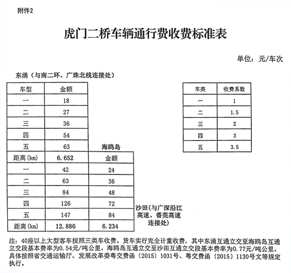粤交费〔2019〕160号请示收悉。同意虎门二桥交工验收通车和收费站收费设施经验收符合省联网收费技术要求后开始收费,收费车型按国家统一标准进行分类,1至5类车的收费系数分别为1、1.5、2、3、3.5,客车实行按次计费,东涌互通立交至海鸥岛互通立交段收费标准为18元/标准车次,海鸥岛互通立交至沙田互通立交段收费标准为24元/标准车次;货车实行完全计重收费,东涌互通立交至海鸥岛互通立交段基本费率为0.54元/吨公里,海鸥岛互通立交至沙田互通立交段基本费率为0.77元/吨公里。
