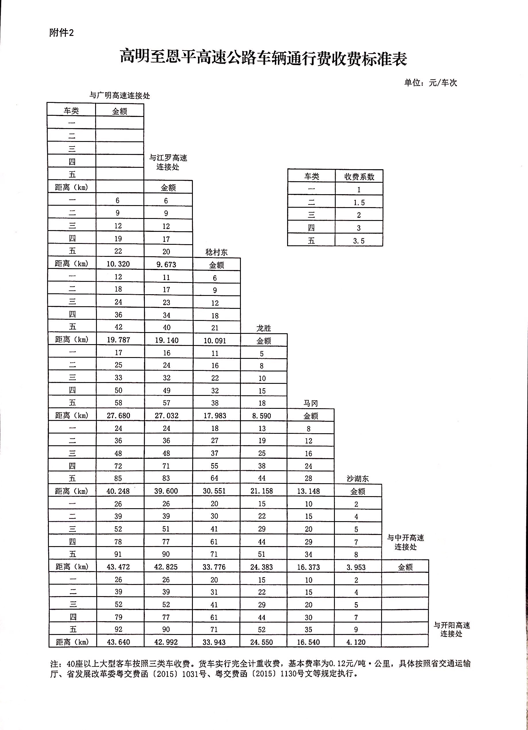 粤交费〔2019〕230号请示收悉。同意高明至恩平高速公路交工验收通车和收费站收费设施经验收符合省联网收费技术要求后开始收费,收费车型按国家统一标准进行分类,1至5类车的收费系数分别为1、1.5、2、3、3.5;货车实行完全计重收费,基本费率为0.12元/吨·公里。