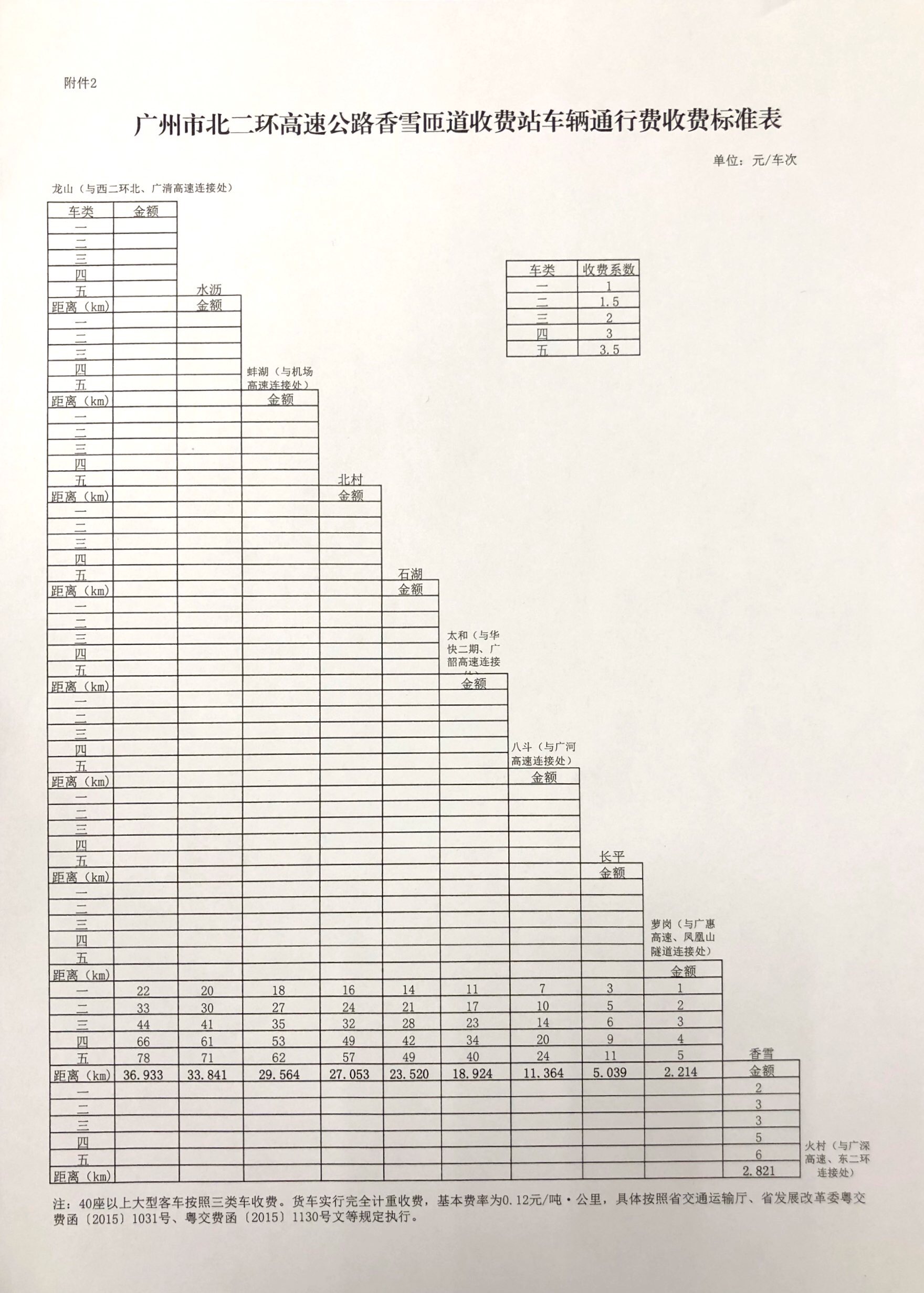 2. 广州市北二环高速公路香雪匝道收费站车辆通行费收费标准表