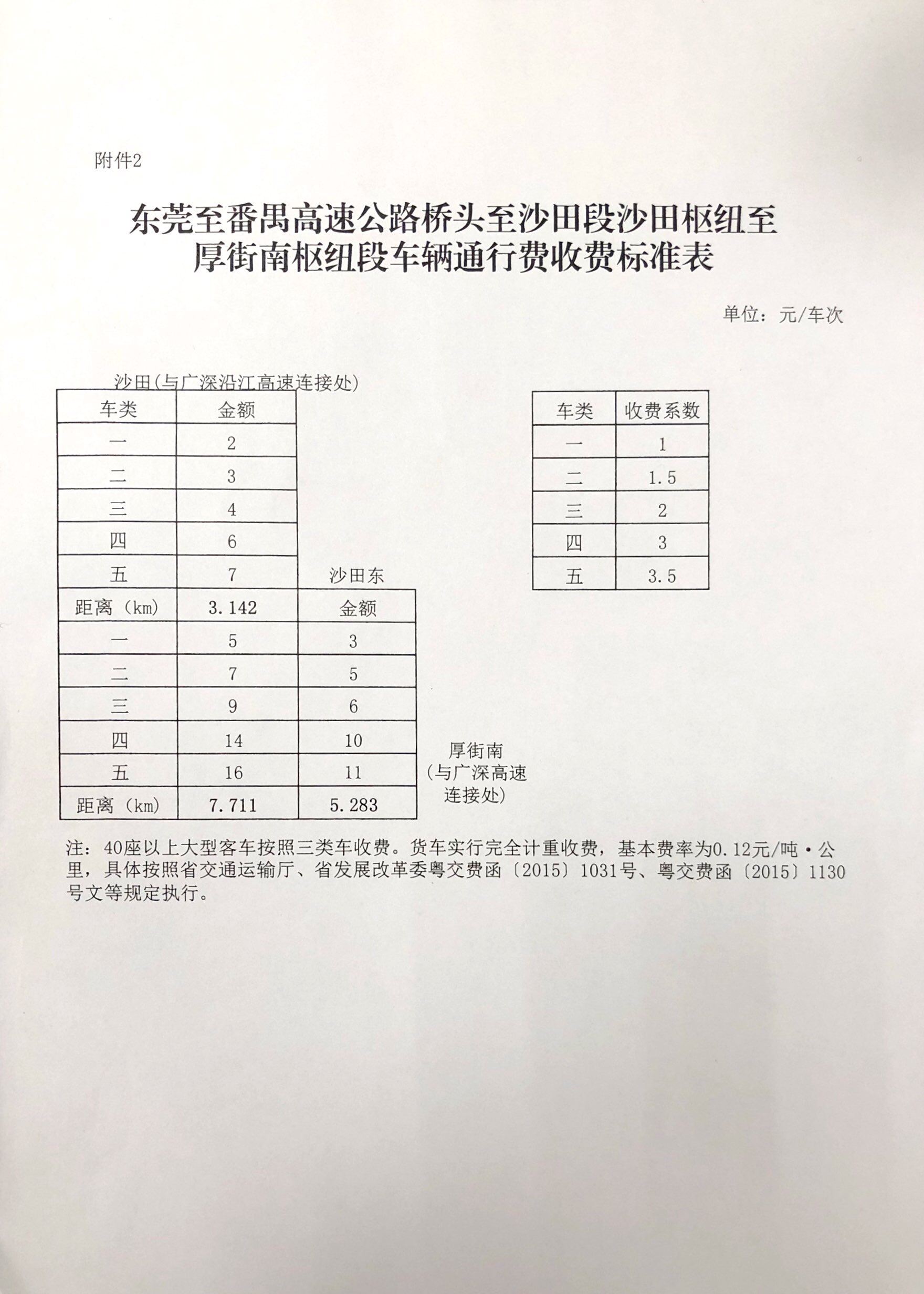 粤交费〔2019〕333号请示收悉。同意东莞至番禺高速公路桥头至沙田段沙田枢纽至厚街南枢纽段交工验收通车和收费站收费设施经验收符合省联网收费技术要求后开始收费,收费车型按国家统一标准进行分类,1至5类车的收费系数分别为1、1.5、2、3、3.5;货车实行完全计重收费,基本费率为0.12元/吨·公里。