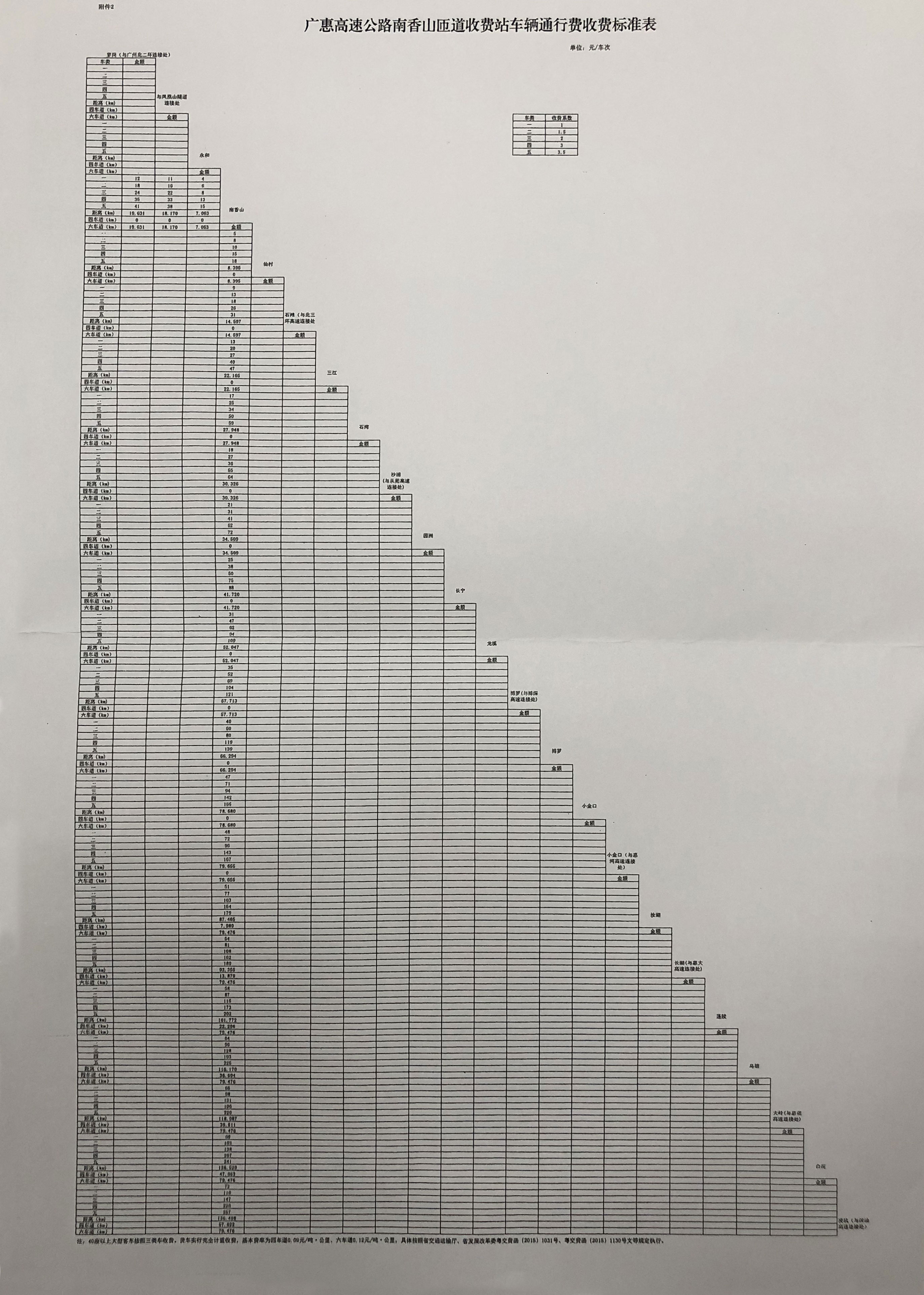粤交费〔2019〕602号请示收悉。同意广惠高速公路南香山匝道收费站收费设施经验收符合省联网收费技术要求后开始收费,收费车型按国家统一标准进行分类,1至5类车的收费系数分别为1、1.5、2、3、3.5;货车实行完全计重收费,基本费率为0.12元/吨·公里。