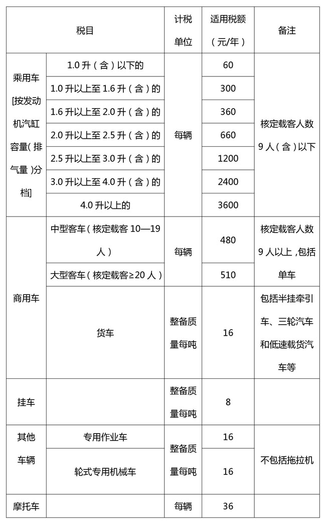 广东省车辆车船税适用税额表